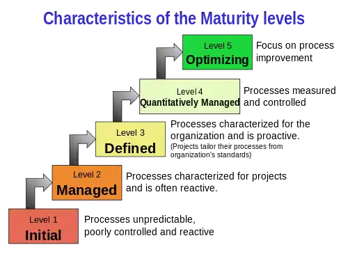 Capability Maturity Model Integration (CMMI) is a process level improvement training and appraisal program. Administered by the CMMI Institute, a subsidiary of ISACA, it was developed at Carnegie Mellon University (CMU). It is required by many U.S. Government contracts, especially in software development. CMU claims CMMI can be used to guide process improvement across a project, division, or an entire organization. CMMI defines the following maturity levels for processes: Initial, Managed, Defined, Quantitatively Managed, and Optimizing. Version 2.0 was published in 2018 (Version 1.3 was published in 2010, and is the reference model for the rest of the information in this article). CMMI is registered in the U.S. Patent and Trademark Office by CMU.[1]