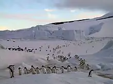 Cape Crozier is within a restricted area and permission is required to visit it. Cape Crozier is home to one of the largest Adélie penguin colonies in the world (~270,000 breeding pairs as of 2012),[9] one of the two southernmost emperor penguin colonies (>1900 breeding pairs as of 2018),[10] and one of the largest south polar skua colonies in the world (~1,000 breeding pairs).[11] It also hosts several species of lichens, including at least three not previously found in this part of Antarctica.[12] It has been designated an Antarctic Specially Protected Area (ASPA 124),[13] and designated an Important Bird Area (IBA) by BirdLife International.[14] From 2001 to 2005, two enormous icebergs known as Iceberg B-15 and C16 were present near shore and affected the Adelie and Emperor penguin colonies.[15][16]