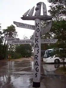 Cape Kolka (Livonian: Kūolka nanā, Latvian: Kolkasrags, Old High German: Domesnes) is a cape on the Baltic Sea, near the entry to Gulf of Riga, on the Livonian coast, in the Courland Peninsula of Latvia. The cape is surrounded by the Irbe Strait (Irbes šaurums) which serves as the natural border with Estonia. Cape Kolka represents the north-western limit of the Gulf of Riga. East of the cape is the island of Ruhnu (Estonia) that lies in the middle of the Gulf.