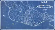 Prior to the discovery of gold at Cape Nome, a mission had been established for a number of years at the cape where one of the Government reindeer herds was maintained.[4] Placer gold was discovered on Snake River in 1898 by a party which started from Golovnin Bay to prospect the gravels of Sinuk River. A rush to the region took place immediately after the news reached the miners about Golovnin Bay, and on October 18, the Cape Nome mining precinct was formed.[5]