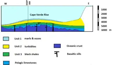 In the course of the Deep Sea Drilling Project and the Ocean Drilling Program, two research drillings were done so far, the DSDP 368 and the ODP 659. At the DSDP 368 location which was drilled 985 meters deep, it is divided into three units, the first unit composes of marls and oozes, the second composes of turbidites and the third composes of black shales, they lie above pelagic limestones and the oceanic crust. In that area are five basaltic sills. DSDP 368 is east of the island of Boa Vista.