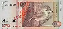 | The Cape Verde warbler (Acrocephalus brevipennis) was featured in a 1000 CVE note circulated from 1992 to 2005 | |