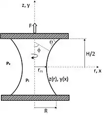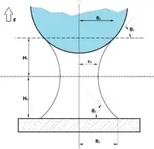 where , dimensionless radius at the contact is and θ is the contact angle. The relation shows that capillary pressure can be positive or negative. The shape of capillary bridges is governed by the equation:[2]