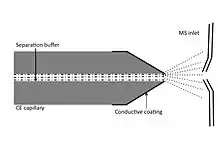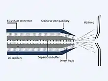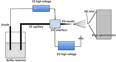 Capillary electrophoresis–mass spectrometry (CE-MS) is an analytical chemistry technique formed by the combination of the liquid separation process of capillary electrophoresis with mass spectrometry.[1] CE-MS combines advantages of both CE and MS to provide high separation efficiency and molecular mass information in a single analysis.[2] It has high resolving power and sensitivity, requires minimal volume (several nanoliters) and can analyze at high speed. Ions are typically formed by electrospray ionization,[3] but they can also be formed by matrix-assisted laser desorption/ionization[4] or other ionization techniques. It has applications in basic research in proteomics[5] and quantitative analysis of biomolecules[6] as well as in clinical medicine.[7][8] Since its introduction in 1987, new developments and applications have made CE-MS a powerful separation and identification technique. Use of CE-MS has increased for protein and peptides analysis and other biomolecules. However, the development of online CE-MS is not without challenges. Understanding of CE, the interface setup, ionization technique and mass detection system is important to tackle problems while coupling capillary electrophoresis to mass spectrometry.