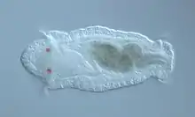 Capitella teleta embryos and early larval stages develop in a brood tube that surrounds the mother.[11] The embryos are approximately 200 µm in diameter.[6] Over the course of approximately a week, the embryos develop into non-feeding larvae which form musculature, a centralized nervous system, two circular ciliary bands, two eye spots, segments, and setae. The larvae are non-feeding and the digestive system develops at a later stage than other organs. Pre-metamorphosis larvae can be categorized into nine stages, with each stage lasting approximately one day.[12] Upon further body elongation and gut maturation, the larvae emerge from the brood tube, and swim forward with a rotational turn via the beating of cilia organized within two circular bands, the prototroch and telotroch.[11] Larvae exhibit positive phototactic behavior in which they swim towards light, potentially an adaptation to aid in larval dispersal[13][14][15] C. teleta is an indirect developer and undergoes metamorphosis from a swimming larva into a burrowing juvenile. Metamorphosis is characterized by cilia loss, body elongation, and crawling behavior.[16] Marine sediment functions as a cue to initiate metamorphosis into juvenile worms that thereafter grow into mature adults.[15] Competent larvae can be induced to metamorphose into juveniles when exposed to the B vitamins Nicotinamide (B3) and Riboflavin (B2), suggesting that these chemical compounds may be responsible for the inductive role of the marine sediment in larval metamorphosis.[17] The number of offspring in each brood tube can vary between 50 - 400 individuals,[6] and is influenced by food quality.[18]