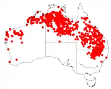 Capparis lasiantha is an endemic Australian plant with a range that extends from the Kimberley region through the Northern Territory and Queensland to northern New South Wales, primarily in drier inland areas although the species extends to the coast in Central Queensland. Common names are numerous and include wyjeelah, nepine, split jack, nipang creeper, nipan, native orange and bush caper.[2]