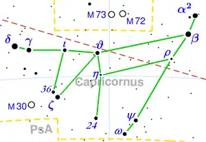 H. A. Rey has suggested an alternative visualization, which graphically shows a goat.[10] The goat's head is formed by the triangle of stars ι Cap, θ Cap, and ζ Cap. The goat's horn sticks out with stars γ Cap and δ Cap. Star δ Cap, at the tip of the horn, is of the third magnitude. The goat's tail consists of stars β Cap and α2 Cap: star β Cap being of the third magnitude. The goat's hind foot consists of stars ψ Cap and ω Cap. Both of these stars are of the fourth magnitude.