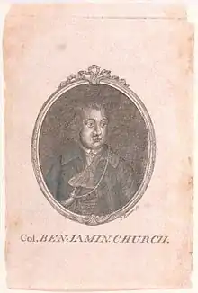 Benjamin Church (c. 1639 – January 17, 1718) was a New England military leader and captain of the first ranger force in America (1675).[1][2] Church was commissioned by Josiah Winslow, the Governor of the Plymouth Colony, to form the first ranger company for King Philip's War. He later commanded the company to raid Acadia during King William's and Queen Anne's wars in the early 1700s, as French and English hostilities played out in North America. The two powers were competing for control in colonial territories. He was promoted to major and ended his service at the rank of colonel, as noted on his gravestone.