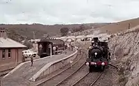 During November, 1940, a halt with a small passenger platform was built at Hoskinstown, and a stopping place was also provided at Foxlow, where stops were made to pick and set down passengers and parcels.[9] The station at Captain's Flat was an island platform, but the station building was at ground level, on the down side of the platform.
