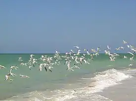 A flock of Royal Terns in flight above the western beach of Upper Captiva Island