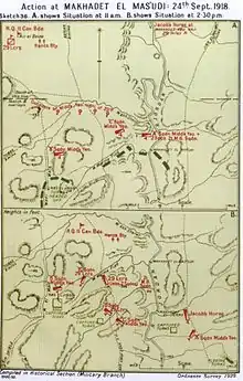 Units of the 4th Cavalry Division continued the advance southwards from Beisan on 24 September, after rations had been distributed. At 10:35 an observation post sighted a column of Ottoman soldiers making for a ford across the Jordan River at Makhadet el Mas'udi, where the Ottoman advanced guard arrived and deployed its machine guns to cover the escape of a larger body of Ottoman troops across another ford 1 mile (1.6 km) further south.[Note 11] (See Falls Sketch Map 36 Detail 'A' Situation at 11:00) The 1/1st County of London (Middlesex) Yeomanry attack at Makhadet el Mas'udi ford succeeded at 12:30, while the 29th Lancers reinforced the Yeomanry attack on the main column, capturing a total of 5,000 prisoners, including an Ottoman divisional commander, with many dead.[73][74]
