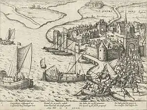 The Spanish held town of Middelburg was under siege, which relied on a Spanish fleet to relieve the place. The Sea Beggars (known as the Guezen) however were successful in defeating and holding any relief attempts the Spanish made in the waters of Zeeland in April at the Battle of Borsele.[5] A second Spanish relief force was turned back after Fort Rammekens surrendered to an Anglo-Rebel force in August. A beggar fleet as a result was able to sail and meet up with the Prince of Orange at Dordrecht.[6] A small force was detached which consisted of English, Scottish, French Huguenot, and Flemish soldiers led by a French Huguenot Lieutenant Colonel de Poyet, numbering 300, with its aim of the capture of Geertruidenberg.[3] The fleet sailed in the night towards the city.[4]
