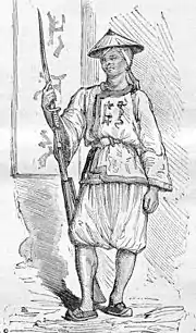 The Vietnamese government, unable to confront Rivière with its own ramshackle army, enlisted the help of Liu Yongfu, whose well-trained and seasoned Black Flag soldiers were to prove a thorn in the side of the French. The Vietnamese also bid for Chinese support. Vietnam had long been a tributary state of China, and China agreed to arm and support the Black Flags and to covertly oppose French operations in Tonkin. The Qing court also sent a strong signal to the French that China would not allow Tonkin to fall under French control. In the summer of 1882 troops of the Chinese Yunnan and Guangxi Armies crossed the border into Tonkin, occupying Lạng Sơn, Bắc Ninh, Hưng Hóa and other towns.[5] The French minister to China, Frédéric Bourée, was so alarmed by the prospect of war with China that in November and December 1882, he negotiated a deal with the Chinese statesman Li Hongzhang to divide Tonkin into French and Chinese spheres of influence. Both negotiators were criticized for giving too much away, and the deal soon unravelled. It was never ratified in China, and in France Jules Ferry's incoming administration disavowed the agreement in March 1883 and recalled Bourée.[6]