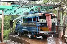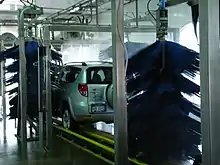 A car wash, carwash,[1] or auto wash is a facility used to clean the exterior,[2] and in some cases the interior, of cars. Car washes can be self-service, full-service (with attendants who wash the vehicle), or fully automated (possibly connected to a filling station). Car washes may also be events where people pay to have their cars washed by volunteers, often using less specialized equipment, as a fundraiser.[3]