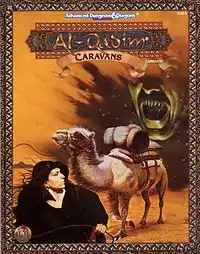 Caravans is an Al-Qadim adventure in which the eponymous caravan serves to move the characters (levels 5–9) across the High Desert in western Zakhara. If the player characters feed ancient poetry to the Persian rug Ala'i the Hungry during the adventure, Ala'i gives them clues by blacking in parts of its weave. Other encounters include a talking tent, weird lightning on a high rock spire, broom-wielding copper automatons, giant roc skeletons, bug-eating centaurs, and an efreeti palace beneath the Pit of Ghuls.[1]