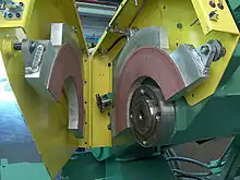 Since carbide saw blades are circular, they are radially the stiffest elements of the power train in the direction of the feed, but very unstable perpendicular to the feed direction. Due to the thin blade body the blades must be stabilized to minimize the side vibration amplitudes. When the first experiments with carbide saws were made, a development engineer of Advanced Machine & Engineering in Rockford stabilized the blade by using a broomstick which he pushed against the vibrating blade, minimizing the vibrations. From this experience a blade stabilizer was developed using two plastic coated ball bearings mounted on eccentric shafts and supported by a welded bracket to the gearbox. Horst Doepcke, who saw this method during experiments carried out by Metalcut, also describes them in his dissertation “Sägen von Rohren mit hartmetallbestückten Kreissägeblättern”.[6] Further Amsaw developments lead to segment stabilizers, whereby on both sides of the blade adjustable plastic-coated plates minimized the blade vibrations (AME). Other manufacturers later used similar slide elements as “vibration dampeners”. These erroneously labeled vibration dampeners did not however dampen the oscillations, but merely minimized the amplitudes. Mr. Doepke describes this function in detail in his dissertation. Recently the Advanced Machine & Engineering Company has developed a pair of front stabilizers for its AMSAW machines arranged close to the point at which the blade enters the material. These stabilizers hydraulically extend, when the carbide teeth have moved past the stabilizer tips before cutting and stabilize the blade which also help to guide the blade into the cut to improve the accuracy. Other forms of stabilizers are listed in German in the VDI Verlag Nr. 1999 by Dipl.-Ing. Rainer Liebrecht. This report especially addresses the effect of vibration on saw blades.[7]