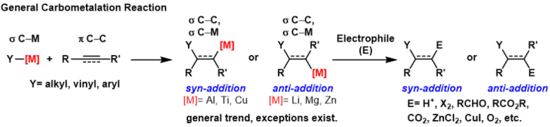 A carbometalation is any reaction where a carbon-metal bond reacts with a carbon-carbon π-bond to produce a new carbon-carbon σ-bond and a carbon-metal σ-bond.[1] The resulting carbon-metal bond can undergo further carbometallation reactions (oligomerization or polymerization see Ziegler-Natta polymerization) or it can be reacted with a variety of electrophiles including halogenating reagents, carbonyls, oxygen, and inorganic salts to produce different organometallic reagents. Carbometalations can be performed on alkynes and alkenes to form products with high geometric purity or enantioselectivity, respectively. Some metals prefer to give the anti-addition product with high selectivity and some yield the syn-addition product. The outcome of syn and anti- addition products is determined by the mechanism of the carbometalation.