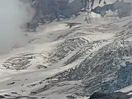 Carbon Glacier is located on the north slope of Mount Rainier in the U.S. state of Washington and is the source of the Carbon River.[2] The snout at the glacier terminal moraine is at about 3,500 feet (1,100 m) above sea level, making it the lowest-elevation glacier in the contiguous United States.[3] The glacier also has the greatest length (5.7 miles (9.2 km)), thickness (700 ft (210 m)) and volume (0.2 cubic miles (0.83 km3)) of any U.S. glacier outside of Alaska.