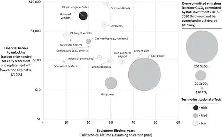 Recent studies by Steven J. Davis and co-authors have quantified the future CO2 emissions that can be expected to be produced by current energy infrastructure [3] and the magnitude of lock-in related to power plants being built each year in China and elsewhere.[4][5]