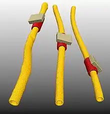 Due to the miniscule magnitude of output generated by a single nanoactuator the necessity to use arrays of such actuators to accomplish a higher task comes into picture. Conventional methods like chemical vapor deposition (CVD) allow the exact placement of nanotubes by growing them directly on the substrate. However, such methods are unable to produce very high qualities of MWNT. Moreover, CVD is a high temperature process that would severely limit the compatibility with other materials in the system. A Si substrate is coated with electron beam resist and soaked in acetone to leave only a thin polymer layer. The substrate is selectively exposed to a low energy electron beam of an SEM that activates the adhesive properties of the polymer later. This forms the basis for the targeting method. The alignment method exploits the surface velocity obtained by a fluid as it flows off a spinning substrate. MWNTs are suspended in orthodicholrobenzene (ODCB) by ultrasonication in an aquasonic bath that separates most MWNT bundles into individual MWNTs. Drops of this suspension are then pipetted one by one onto the center of a silicon substrate mounted on a spin coater rotating at 3000 rpm. Each subsequent drop of the suspension is pipetted only after the previous drop has completely dried to ensure larger density and better alignment of the MWNTs (90% of the MWNTs over 1 µm long lie within 1°). Standard electron beam lithography is used to pattern the remaining components of the nanoactuators.[7]