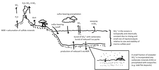 Carbonate-associated sulfates (CAS) are sulfate species found in association with carbonate minerals, either as inclusions, adsorbed phases, or in distorted sites within the carbonate mineral lattice.[1][2][3][4][5][6][7][8] It is derived primarily from dissolved sulfate in the solution from which the carbonate precipitates. In the ocean, the source of this sulfate is a combination of riverine and atmospheric inputs, as well as the products of marine hydrothermal reactions and biomass remineralisation.[9][10][11][12][13] CAS is a common component of most carbonate rocks, having concentrations in the parts per thousand within biogenic carbonates and parts per million within abiogenic carbonates.[14][15][16][17] Through its abundance and sulfur isotope composition, it provides a valuable record of the global sulfur cycle across time and space.