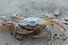 Carcinus (Greek: Καρκίνος Karkinos) is a genus of crabs, which includes Carcinus maenas, an important invasive species, and C. aestuarii, a species endemic to the Mediterranean Sea.[1]