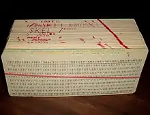 This IBM card format, introduced in 1928,[47] has rectangular holes, 80 columns, and 10 rows.[48] Card size is 7+3⁄8 by 3+1⁄4 inches (187 by 83 mm). The cards are made of smooth stock, 0.007 inches (180 μm) thick. There are about 143 cards to the inch (56/cm). In 1964, IBM changed from square to round corners.[49] They come typically in boxes of 2000 cards[50] or as continuous form cards. Continuous form cards could be both pre-numbered and pre-punched for document control (checks, for example).[51]