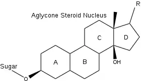 The general structure of a cardiac glycoside consists of a steroid molecule attached to a sugar (glycoside) and an R group.[4] The steroid nucleus consists of four fused rings to which other functional groups such as methyl, hydroxyl, and aldehyde groups can be attached to influence the overall molecule's biological activity.[4] Cardiac glycosides also vary in the groups attached at either end of the steroid. Specifically, different sugar groups attached at the sugar end of the steroid can alter the molecule's solubility and kinetics; however, the lactone moiety at the R group end only serves a structural function.[5]