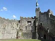 Upon Isabel's death in 1217 the castle passed through her sister to Gilbert de Clare, becoming part of the Honour of Clare, a major grouping of estates and fortifications in medieval England.[39] The castle formed the centre of the family's power in South Wales, although the de Clares typically preferred to reside in their castles at Clare and Tonbridge.[40] Gilbert's son, Richard de Clare, 6th Earl of Gloucester, carried out building work at the castle in the late 13th century, constructing the Black Tower that forms part of the southern gateway seen today.[41] On the ground floor the tower contained the Stavell Oged and Stavell Wenn chambers, with three rooms constructed above them.[41] Richard was also probably responsible for rebuilding the northern and eastern walls of the inner bailey in stone.[42] The inner bailey was reached through a gatehouse on the eastern side, protected by two circular towers and later called the Exchequer Gate.[43] The defensive work may have been prompted by the threat posed by the hostile Welsh leader Llywelyn ap Gruffudd, Prince of Wales.