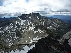 Cardinal Peak is the highest peak of the Chelan Mountains, a subrange of the Cascade Range in the U.S. state of Washington. It is located in Wenatchee National Forest at the head of the Entiat River drainage basin, in Chelan County. To the west and north, streams flow into Lake Chelan. Cardinal Peak is less than 5 miles (8.0 km) from the lake and rises 7,500 feet (2,300 m) above the lakeshore.[3] At 8,595 feet (2,620 m) high, it is the 49th highest peak in Washington. Its 2,070-foot (630 m) prominence ranks 132nd in the state.[1][4]