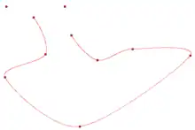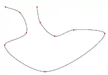 Cardinal spline example in 2D. The line represents the curve, and the squares represent the control points . Notice that the curve does not reach the first and last points; these points do, however, affect the shape of the curve. The tension parameter used is 0.1