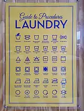 A laundry symbol, also called a care symbol, is a pictogram indicating the manufacturer's suggestions as to methods of washing, drying, dry-cleaning and ironing clothing. Such symbols are written on labels, known as care labels or care tags, attached to clothing to indicate how a particular item should best be cleaned. While there are internationally recognized standards for the care labels and pictograms, their exact use and form differ by region. In some standards, pictograms coexist with or are complemented by written instructions.