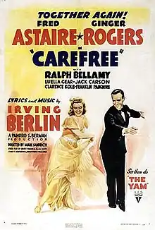 Carefree is a 1938 musical film starring Fred Astaire and Ginger Rogers. With a plot similar to screwball comedies of the period, Carefree is the shortest of the Astaire-Rogers films, featuring only four musical numbers. Carefree is often remembered as the film in which Astaire and Rogers shared a long on-screen kiss at the conclusion of their dance to "I Used to Be Color Blind," all previous kisses having been either quick pecks or simply implied.