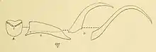 The radula is small and rather obscure. The uncini cover the median rows, and cross even the uncini of the opposite side. The rhachidian or median tooth has a subquadrate basal part, with rounded, convex posterior and less convex lateral margins. It has a broad, triangular cusp, with one small median denticle and about 6 smaller ones on each side. The laterals one on each side have a transversely triangular shape, with an unarmed, arched upper and concave proximal and basal margin, with blunt points at the proximal and distal extremities of the basal margin. On each side are 3-4 uncini which are long, slender and strongly curved. Though this radula has some resemblance with that of Aporrhais, Verrill stated[4] that it should be taenioglossate, as the "Siboga"-specimen has a radula with at least 9 rows of teeth and probably 11.