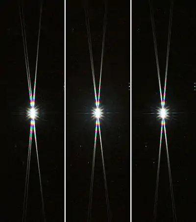 In the example images below, focus error is obvious in the first two images. The third image is very close to perfect focus as shown by the equal spacing between the elongated spikes on the left and the right.