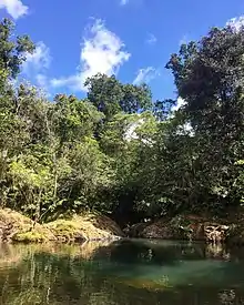 Charco Azul (Spanish for blue pool), located in the municipality of Patillas, is one of the main highlights of the state forest. This is a clear, blue-colored natural pool formed by the Charco Azul river falls, which flow into the Patillas River. The area, located along PR-184, offers sites for picnics, camping and showers and restrooms for people who wish to swim in it.[7]