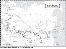Mannerheim, who had a long career in the Imperial Russian army, also rose to become a courtier of Emperor of all the Russias Nicholas II.[50] When Mannerheim returned to St. Petersburg, he was asked to undertake a journey through Turkestan to Beijing as a secret intelligence officer. The Russian General Staff wanted accurate, on-the-ground intelligence about the reforms and activities by the Qing dynasty, as well as the military feasibility of invading Western China: a possible move in their struggle with Britain for control of inner Asia.[51][52] Disguised as an ethnographic collector, he joined the French archeologist Paul Pelliot's expedition at Samarkand in Russian Turkestan (now Uzbekistan). They started from the terminus of the Trans-Caspian Railway in Andijan in July 1906, but Mannerheim quarreled with Pelliot,[51] so he made the greater part of the expedition on his own.[53]