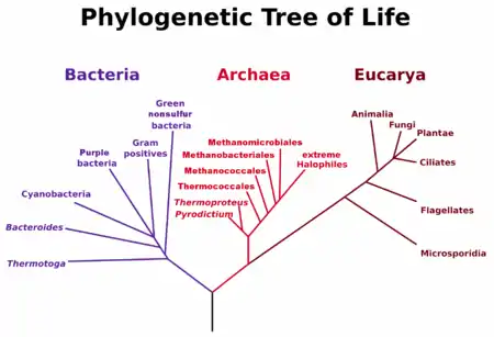 Carl Richard Woese (/ˈwoʊz/;[2] July 15, 1928 – December 30, 2012) was an American microbiologist and biophysicist. Woese is famous for defining the Archaea (a new domain of life) in 1977 through a pioneering phylogenetic taxonomy of 16S ribosomal RNA, a technique that has revolutionized microbiology.[3][4][5][6] He also originated the RNA world hypothesis in 1967, although not by that name.[7] Woese held the Stanley O. Ikenberry Chair and was professor of microbiology at the University of Illinois at Urbana-Champaign.[8][9][10]