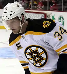 He scored his first NHL goal later in the year, on 31 October, beating Jonas Hiller as the first Bruins goal of a 3–2 home shootout victory over the Anaheim Ducks.[13]