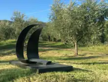 Carla Lavatelli's sculptures are in many prominent museum and private collections across the United States and Europe, as well as in public and communal spaces and university campuses. Notable examples include her first abstract work, Ginko Biloba (1971), carved from red Persian travertine, which is located in the Phillips Collection in Washington, D.C.[4] The work had been gifted to the Phillips by Lavatelli in 1974 on the occasion of her exhibition there the same year.[30] Other important works include Stele For a Prayer (1971), a monolithic work in white Carrara marble and slate in the collection of the San Francisco Museum of Modern Art.[3] Her carved stone and silver jewelry, which she called "Sculptures to Wear" are in the collection of the Minneapolis Institute of Arts.[31] Several versions of Lavatelli's large-scale abstract sculpture in bronze and stainless steel, 1 ½ (1969–70), are in the museum collections of institutions such as Stanford University in Palo Alto, California, and Brown University in Providence, Rhode Island.[6] Originally installed on the Stanford campus in front of the law school, 1 ½ was restored in 1996 by Lavatelli and relocated in the Fairchild Chapel.[32] At Brown, 1 ½ has been on view in front of the brutalist high-rise Science Library building since its installation in 1975.[33] Bill Van Siclen, an art critic for the Providence Journal, remarked in a 2007 article that Lavatelli's 1 ½ resembled a “giant chrome-plated engine part,” and that “had she not become a sculptor, [she] clearly had a future as a sports car designer.”[34] In 1978, Lavatelli was commissioned to permanently install a spherical bronze sculpture in a newly created pond at the Botanical Gardens in Freiburg, Germany, which she titled Golden Pond.[35] During the 1990s, she worked on several temporary and permanent site-specific installations, including "happenings" involving paper and reed sculptures in Pistoia, Italy, and New York. In 1995, the town of Mougins, in France, commissioned her to create a stone bench installation with a fountain set into a rough-hewn travertine in Place du Banc des Amis off the Rue d'Eglisse.[36] On the occasion of the unveiling of the sculpture, Lavatelli was presented with the town's honorary Gold Medal in 1995.[1]