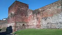 The West Walls are still needed to retain a former river cliff on the River Caldew and were not demolished. They have however been considerably altered over the years. Comparisons between old engravings and current archaeological evidence suggest the wall has been straightened.[7] Between the bridge and the castle, there were houses built up against the walls until 1952.[8] Other buildings erected against the walls have been largely removed so the walls are visible again. Remaining buildings have been listed because they incorporate wall fragments.[9]
