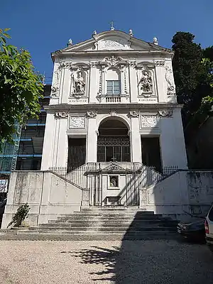 As house architect of prince Giovanni Battista Pamphili Aldobrandini, he built the entrance gate and garden wall of the Villa Aldobrandini in Frascati, accomplished in 1693.[1][3] He also designed the tomb monument erected by the prince from 1705–07 to his ancestor Cardinal Cinzio Aldobrandini in San Pietro in Vincoli. The sculpture of a winged skeleton and a pair of putti on this monument are by Pierre Le Gros the Younger.[4]