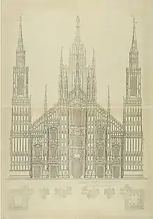 There appear to be two prominent artists of the same name in Milan, overlapping somewhat, alive in the late 16th and early 17th century. The present Carlo Buzzi, whose name may also be written as Buti, Buzio, Butio, Albutio, or Albuzio, is mentioned in 1629, after the death of Fabio Mangione, as architect of the Duomo of Milan. At this time Francesco Maria Richini soon became architect for the cathedral.[1] An sketch (1647) by Buzzi of a plan for the facade of the cathedral, etched by Cesare Bassani show a Gothic design with two flanking bell-towers; this work was not completed until the 19th-century.[2]
