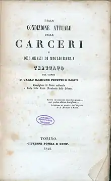 - Carlo Ilarione Petitti, Della condizione attuale delle carceri e dei mezzi di migliorarla (Turin: Giuseppe Pomba, 1840).