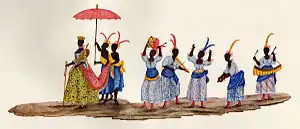 The painting on the top right, is called "The Queen and Her Suite." This picture above has nothing do with shown costumes. This was a parade that was being held in Brazil in the King and Queen of Brazil in their honours. Carlos Julião attended drawing classes which prepared Portuguese officers assigned around the empire to collect visual information about the peoples and territories colonized by the Portuguese. For six years, Julião served in India and illustrated a manuscript called "Noticia Summária do Gentilismo na Ásia", where with drawings and texts he reproduced Hindu beliefs of Brahman tradition.[9] These images are included in the catalogue "Riscos Iluminados de Figurinhos de Negros e Brancos dos Uzos do Rio de Janeiro e Serro Frio" maintained by the National Library in Rio de Janeiro, which was published in 1960. The title of the catalogue refers to 43 watercolor drawings portraying indigenous, military, costumes, slaves and their activities including diamond mining. Ethnographic representations of colonial Brazil; an ethnographic record of great utility to the authorities that run the empire. In the same catalogue are also included 33 drawings of Peruvian indigenous ceramic objects and textiles, confiscated from a Spanish shipwreck at Peniche in Portugal.[10] On the back of these drawings, there are watercolor sketches representing the culture of Portugal’s central plateau where Peniche is located. The three groups of illustrations related to India, Brazil and Peru were published in 1960 by the National Library but they were already property of the institution since 1947, after they were acquired from an anonymous seller, residing in the United States. Its publication in 1960 commemorated the 500th anniversary of Prince Henry, the navigator along with various events and publications which happened that year simultaneously in Portugal and Brazil. Less known but also published that year in the exhibition catalogue "Engenharia Militar no Brasil e no Ultramar Português Antigo e Moderno",[11] are the two works preserved by the department of archaeological studies in military engineering at Lisbon. One is illustrated on the top by a view of the city of Salvador da Bahia taken from the bay, with the building numbered with legends. Other elements were added to the composition, such as the plans of the city fortresses and similar figures to the "Riscos Iluminados" catalogue, representing the city’s population of masters and slaves. The other work shows four views of the city ports of Rio, Goa, Daman e Macao, as well as various figures representing those regions of the empire.