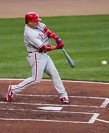 In the 2013 season, Ruiz compiled a .268 batting average, five home runs, and 37 RBIs in 92 games, his lowest major league total since 2006.[31] After the season, Ruiz became a free agent. He re-signed on November 21, 2013, to a three-year contract worth US$26,000,000 plus a club option for a fourth season, giving the Phillies have an option to bring Ruiz back for a fourth season, at their discretion.[42] Though one writer suggested his 2013 year might just have been an "aberration",[43] most thought the Phillies overpaid to keep Ruiz, who turned 35 during the subsequent offseason.[44][45][46]
