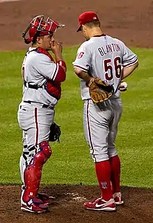 In 2010, Ruiz had a season filled with "indelible moments".[23] He was catcher for Roy Halladay's perfect game on May 29, 2010, against the Florida Marlins and Halladay's no-hitter against the Cincinnati Reds in the first game of the National League Divisional Series on October 6, 2010,[24] the first time a catcher had caught two no-hitters in one season since 1972.[25] On May 4, he hit a walk-off home run, the second of his career, to lead the Phillies over the St. Louis Cardinals.[26] Ruiz spent time on the DL in late June and early July with a concussion, but according to manager Charlie Manuel returned with a more efficient swing that allowed him to hit better against power pitchers.[23] He led the team with a .302 batting average and a .400 on-base percentage. Both statistics also led National League catchers,[5] and he even received a few votes for NL most valuable player.[27] During the 2010 postseason,[lower-alpha 2] he did not perform as well as in past years—in nine games, he hit .192 with two home runs and four RBIs.[28] Fans voted Ruiz the "X-Factor Player of the Year" in MLB's This Year in Baseball Awards.[29] He also received the Pride of Philadelphia Award from the Philadelphia Sports Hall of Fame. Halladay called Ruiz a "rock" behind the plate, and presented him with a replica of his Cy Young Award.[30]