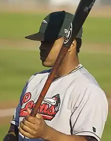 On July 26, 2008, the Dodgers traded Santana and pitcher Jon Meloan to the Cleveland Indians for third baseman Casey Blake.[3] Santana appeared in 130 games combined in 2008 with the Akron Aeros, Inland Empire 66ers of San Bernardino, and Kinston Indians during the 2008 season, with the majority at San Bernardino and Kinston at the Class A-Advanced level, and played primarily catcher. On offense, he hit .326, amassed .431 on-base percentage (OBP), .568 slugging percentage (SLG), .999 on-base plus slugging (OPS), 125 runs scored, 21 home runs, collected 117 runs batted in (RBI), 89 bases on balls (BB) and 85 strikeouts.[2] Santana was named California League Most Valuable Player (MVP). He also earned mention as Hi-A Player of the Year and made the Hi-A All-Star team, California League All-Star team, and Baseball America's All-Star second team.[4]