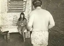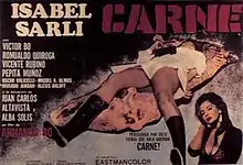 Writers Raúl Manrupe and María Alejandra Portela characterized the film as having "black and white footage without any explanation, red as the dominant color and camp carried to its ultimate consequences."[3] Throughout the film, the female body is objectified as "a piece of meat", featuring overlays of images of cuts of meat and Sarli's body.[4] Writer Tamara Drajner Barredo felt that "this identification of the female body with the meat has as a correlate an identification of the sexual desire with an animalized and irrational carnal desire."[4] This is made explicit in the final dialogue, in which Antonio tells Delicia that they raped her "to satisfy the animal instinct that we all carry inside. But without soul, without love."[4] Bó always maintained that his films dealt with social issues, evident in early films such as Thunder Among the Leaves from 1958 and Sabaleros from 1959.[4] However, this intention of social criticism and realism of his first films was diluted as the director and Sarli acquired national and international recognition, replacing them with traditional melodrama, crime and picaresque, where the erotic scenes "acquired their own autonomy."[4] Nevertheless, in a 1974 interview for magazine Siete Días Bó still claimed that his films "deal with social issues, but since Isabel acts in them, sex has implications in the argument."[4] The social problem depicted in Carne is that of violence; it might even be argued that the film seeks to draw attention to violence against women.[5] In this matter, Bó stated: