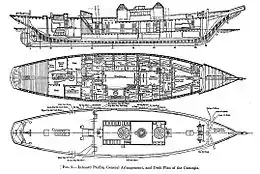 Louis Agricola Bauer, the first director of the Department of Terrestrial Magnetism at the Carnegie Institution, wanted to focus on acquiring oceanic magnetic data to improve the understanding of the Earth's magnetic field.[3] After an experiment in which the brigantine Galilee was adapted by removing as much magnetic material as possible, it became clear that a new entirely non-magnetic ship was needed. After convincing the institution's board, Bauer set about getting such a vessel built. Carnegie was designed by naval architect Henry J. Gielow and built at the Tebo Yacht Basin Company yard in Brooklyn, New York. Gielow's design minimised the amount of magnetic materials used in its construction and fittings. Locust trunnels were used to hold together the timbers with the help of some bronze or copper bolts.[1] Carnegie was primarily a sailing vessel, but its unique, non-ferrous, auxiliary engine was capable of propelling the vessel in calm weather at a speed of 6 knots.[4] The construction used white oak, yellow pine, and Oregon pine with copper or bronze-composition metal for all the fastenings in the hull or rigging.[5] The anchors were made of bronze and were attached to 11 inches (28 cm) hemp cables. A reserve engine was required to increase manoeuvrability and allow passage through the doldrums, so Carnegie was fitted with a producer gas engine, made mainly of copper and bronze, using coal as a fuel. She cost $115,000 (about 10 million dollars today) to build.[3]